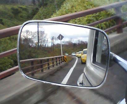オロフレ峠を激走。ミラー越しはすべてビートル。